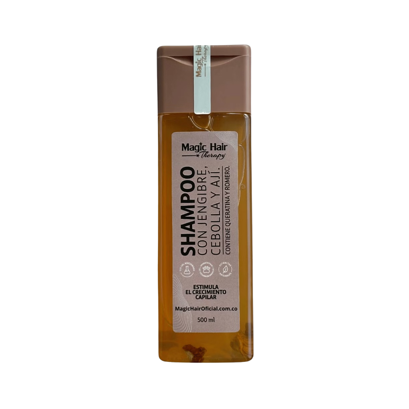 Shampoo de Cebolla y Jengibre para Crecimiento del Cabello Magic Hair formulado con extractos de cebolla, jengibre y ají, conocidos por sus propiedades estimulantes del crecimiento del cabello. Además, contiene una combinación única de ingredientes naturales que nutren y fortalecen el cabello desde la raíz hasta las puntas.